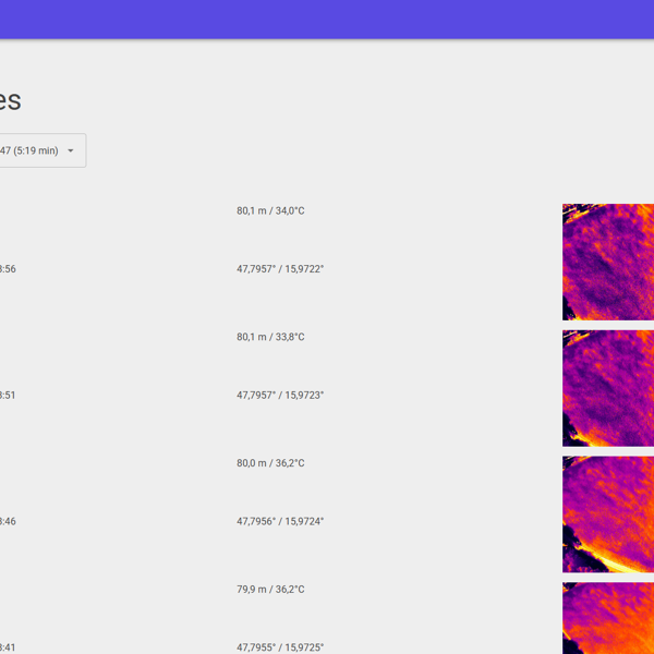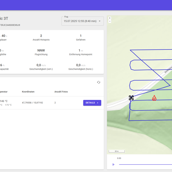 A central element of the project is the automated processing of thermal images captured by drones. Using AI, temperature data and metadata (e.g., GPS position, flight altitude, camera orientation) are evaluated to identify signs of fire. The data is transferred to a cloud API and visualized in a web frontend, which also includes a configurable alarm system.